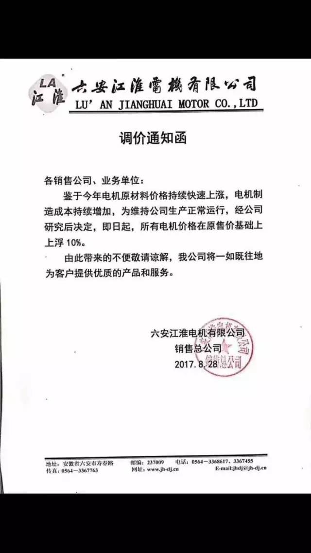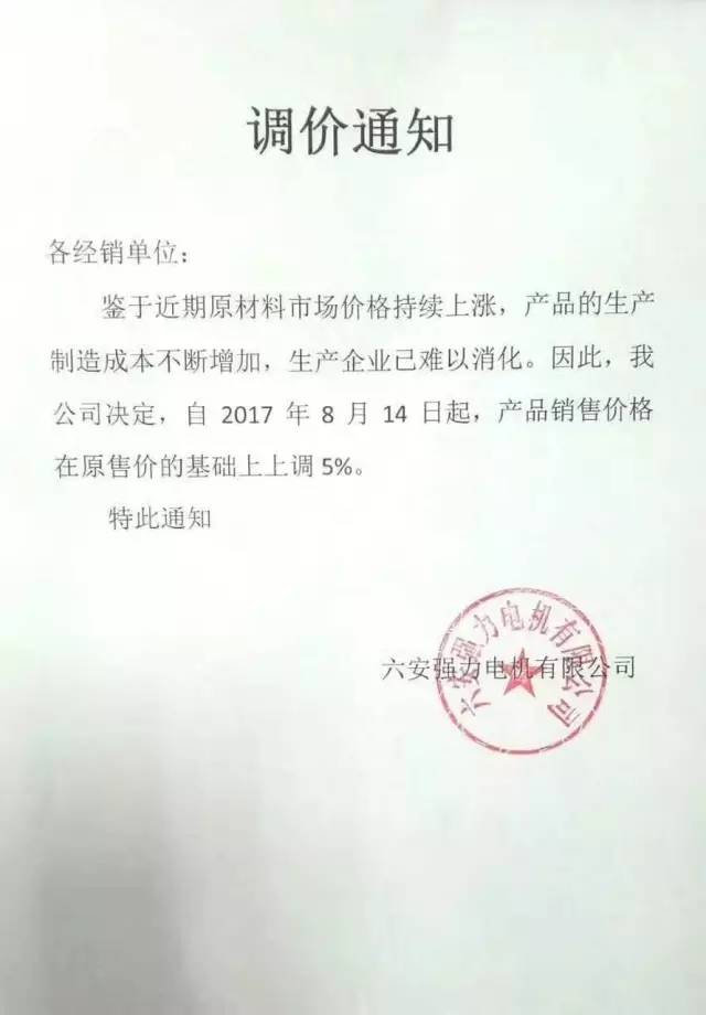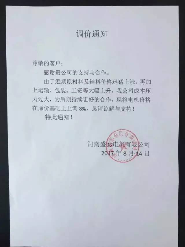 繼硅鋼、銅鋁、鑄件等價格上漲之后,電機(jī)行業(yè)又將面臨來自機(jī)械設(shè)備漲價所帶來的各種成本壓力。近日來,工業(yè)電機(jī)企業(yè)在接到上游企業(yè)的多輪調(diào)價后終于還是扛不住了,全國各大重點(diǎn)工業(yè)電機(jī)生產(chǎn)企業(yè)再次集體提價10%—12%,希望這次不得已的提價不會對電機(jī)下游客戶單位造成太多影響,下面是本編輯部收到的多家電機(jī)企業(yè)調(diào)價通知。