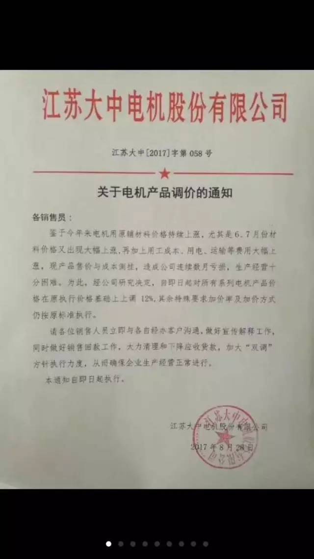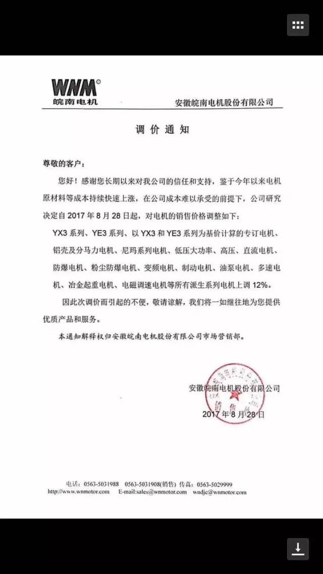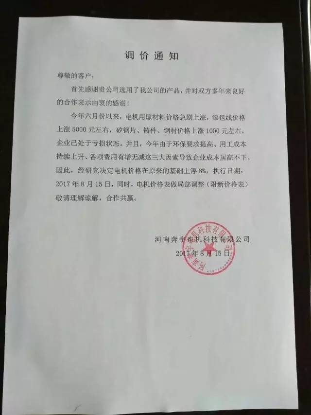 繼硅鋼、銅鋁、鑄件等價格上漲之后,電機(jī)行業(yè)又將面臨來自機(jī)械設(shè)備漲價所帶來的各種成本壓力。近日來,工業(yè)電機(jī)企業(yè)在接到上游企業(yè)的多輪調(diào)價后終于還是扛不住了,全國各大重點(diǎn)工業(yè)電機(jī)生產(chǎn)企業(yè)再次集體提價10%—12%,希望這次不得已的提價不會對電機(jī)下游客戶單位造成太多影響,下面是本編輯部收到的多家電機(jī)企業(yè)調(diào)價通知。